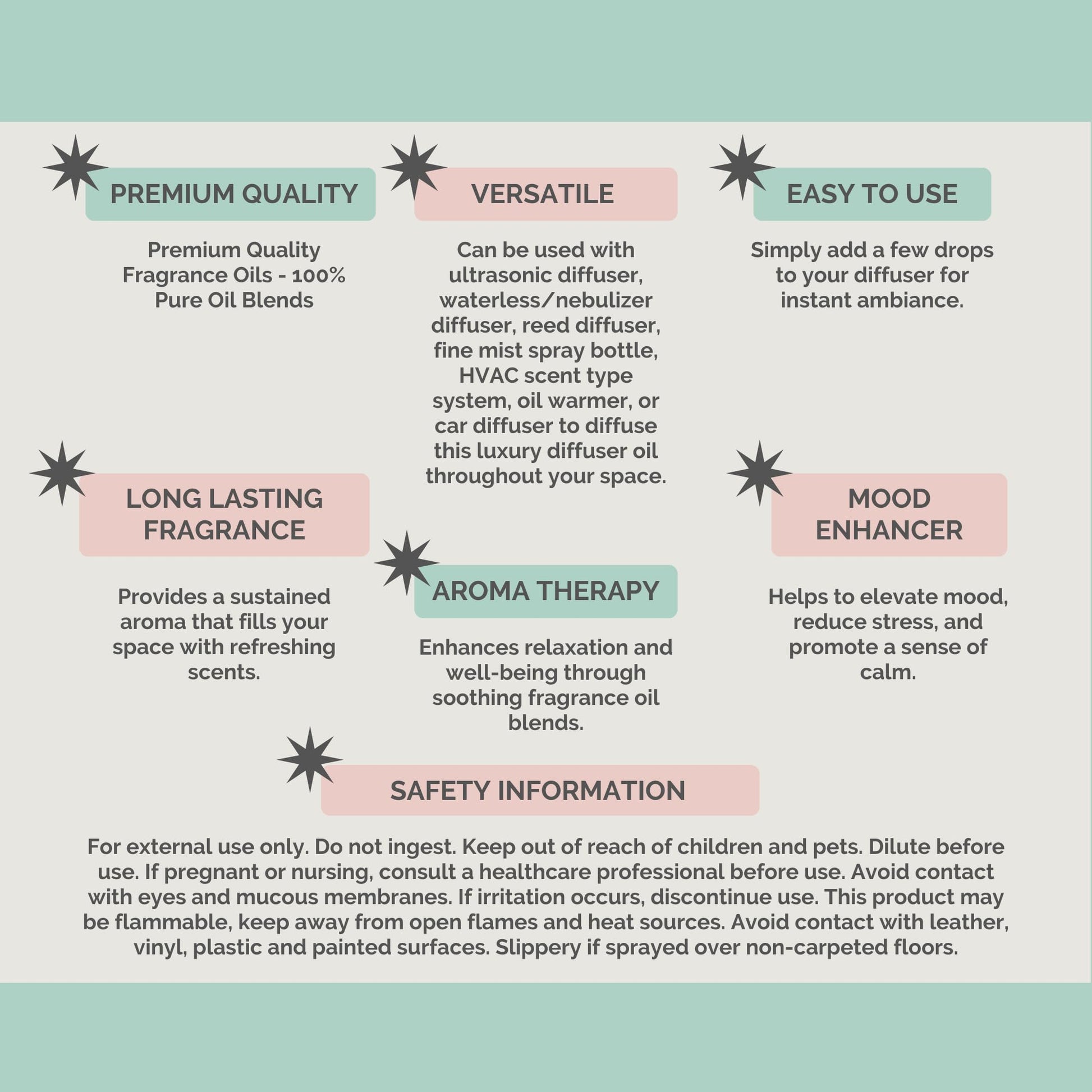 - VERSATILE - Can be used with ultrasonic diffuser, waterless/nebulizer diffuser, reed diffuser, fine mist spray bottle, HVAC scent type system, oil warmer, or car diffuser to diffuse this luxury diffuser oil throughout your space.