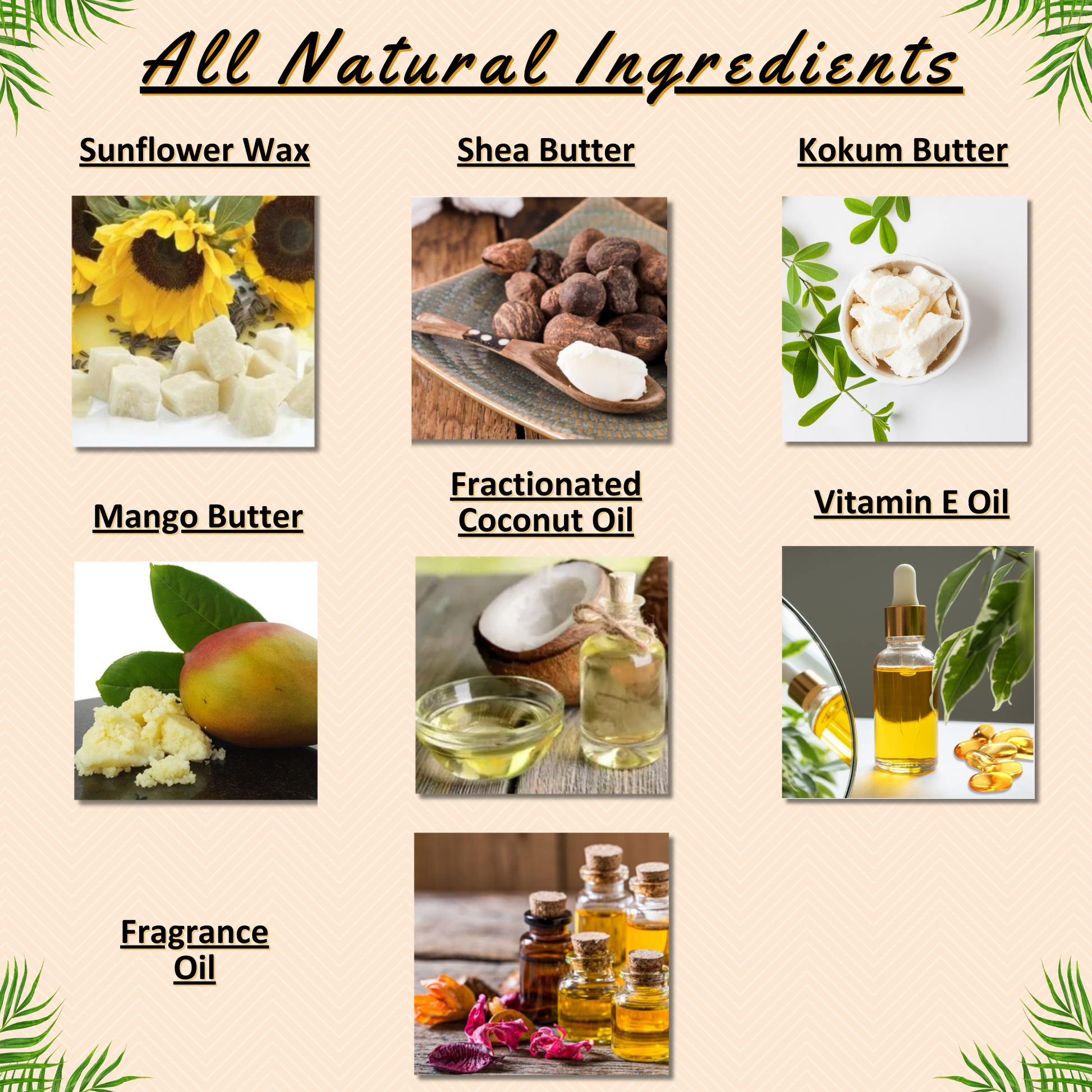 All-Natural Base: Sunflower wax, shea, kokum & mango butters with fractionated coconut & vitamin E oils